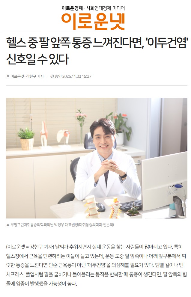 [언론보도] 헬스 중 팔 앞쪽 통증 느껴진다면, '이두건염' 신호일 수 있다 작성일 : 2025.11.03 부평그린마취통증의학과 댓글 : 0 조회 : 323 [기사 원문 보러가기] https://www.eroun.net/news/articleView.html?idxno=66173 자세한 내용은 링크를 클릭하시면 확인하실 수 있습니다.